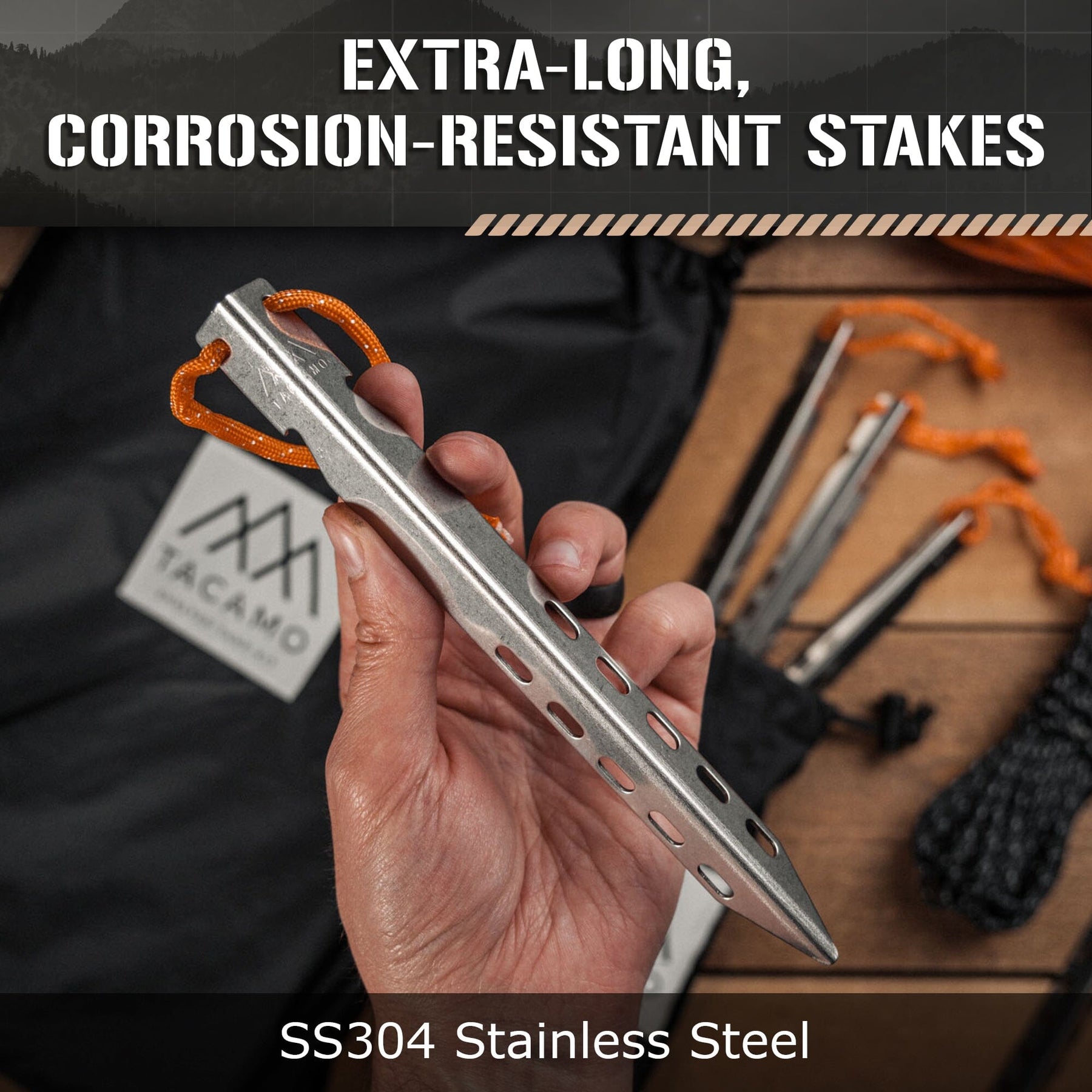 • DURABILITY YOU CAN RELY ON - Forget flimsy stakes that bend or pull loose in a storm. Our corrosion-resistant stainless steel stakes are wider and longer, anchoring your bushcraft tarp securely even in sandy or compact soil to keep your shelter stable during strong winds.