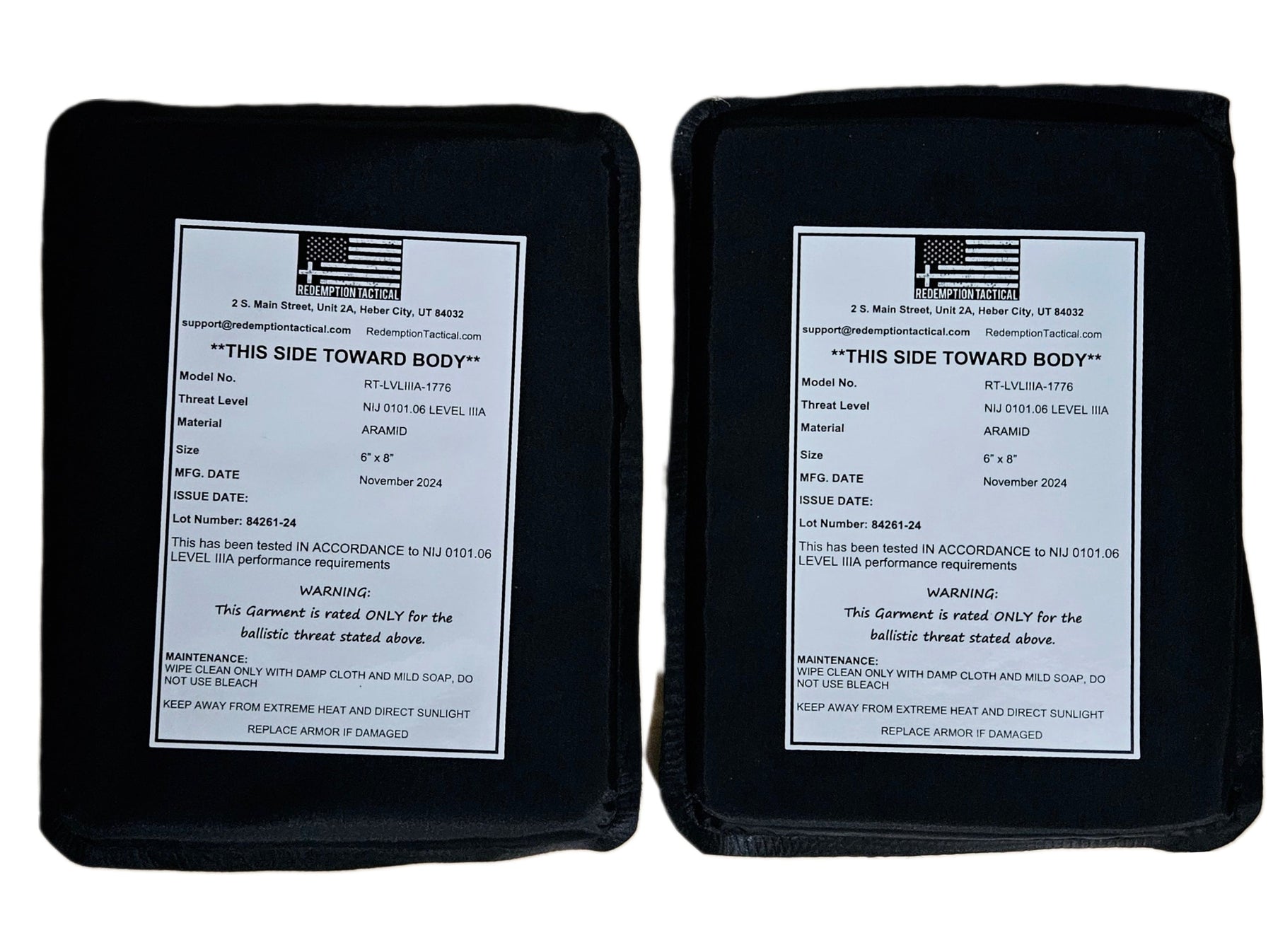 They are made of the new Lightweight PE Material. They only weigh 6 ounces each and are thin to fit inside any pouch. These are flexible and give you more mobility while protecting you from knife attacks, and small caliper bullets up to .44 magnum that are rated in the level IIIA category (.44 magnum 240gr. SJHP, 1,732 feet per second)