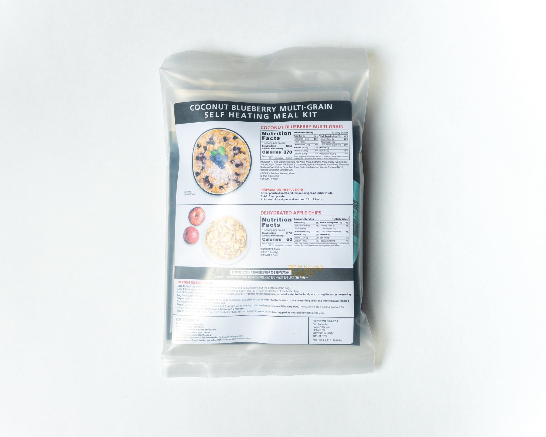 Each Self Heating Meal kit is equipped with all items necessary to warm and heat a single meal! Both the Coconut Blueberry Multi-Grain and apple chips are packaged in a mylar foil bag to deflect any pests, moisture, or light. The only item you need is 1-3/4 cups of water.